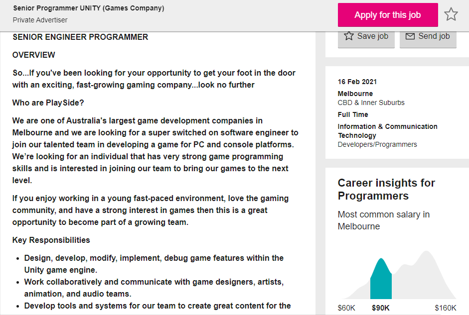 This is an example of a job that I would be interested in going for. The role itself is a senior programmer for a “fast-growing gaming company” known as PlaySide. The role would require me to work with a team of programmers and developers to develop games for PC and other platforms. The role also searches for those who a strong interest in games and the gaming community.