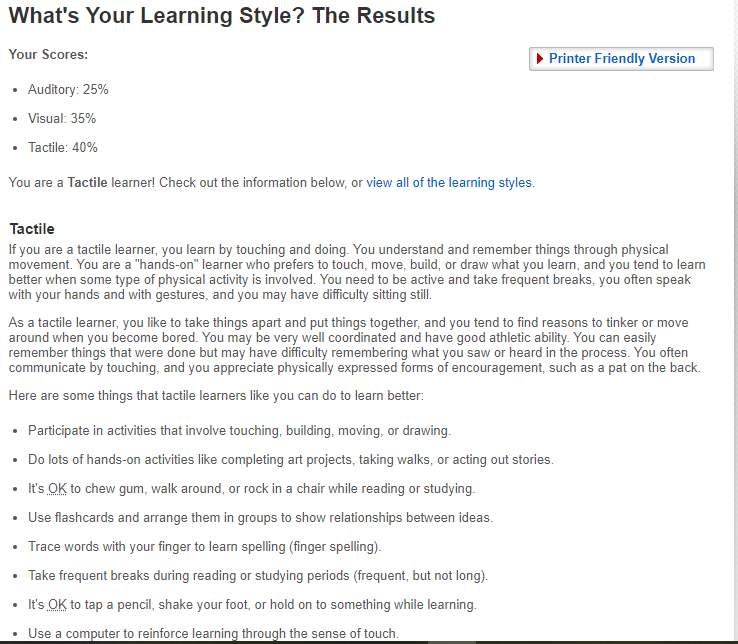 According to this online learner style test, I am a tactile learner, which means that I learn best by touching and doing things. As a tactile learner, I prefer to take things apart and then put them back together again and I tend to find reasons to move around or tinker with things. I tend to learn better when there is some sort of physical activity involved and I tend to believe that taking breaks and being active while studying is good for you.